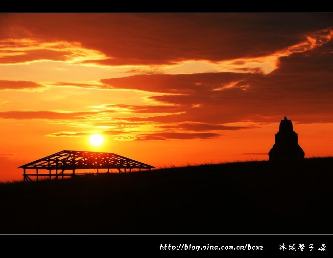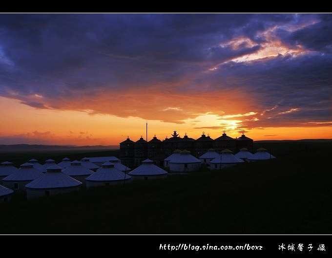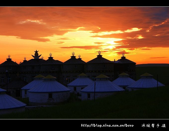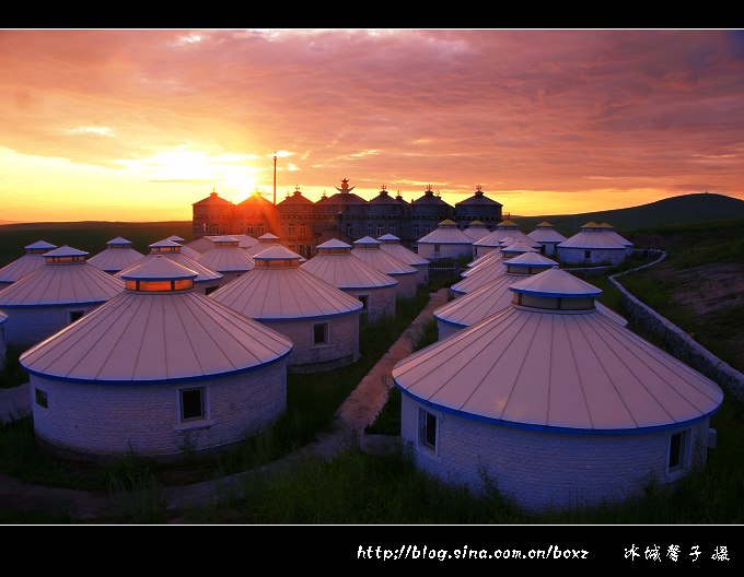 这几年,我在林区、江畔、海边无数次地等待日出的灿烂一刻,但看草原日出还真是第一次。金帐汗蒙古部落是呼伦贝尔唯一以游牧部落为景观的旅游景点,位于呼伦贝尔草原"中国第一曲水"的莫尔格勒河畔。这里是中外驰名的天然牧场,一代天骄成吉思汁曾在这里秣马厉兵,与各部落争雄,最终占据了呼伦贝尔草原。金帐汗景点的布局,就是当年成吉思汗行帐的缩影和再现,电影《成吉思汗》好多场景都是在这里拍摄的。