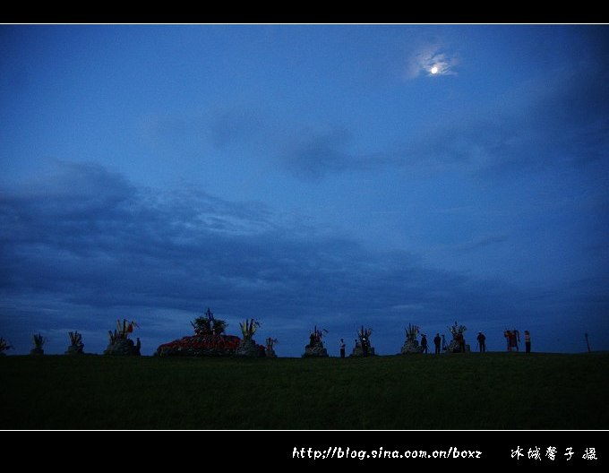 走出蒙古包时天色刚刚泛白,宝蓝色的天空上挂着一轮圆月,所有的蒙古包都在沉睡,只有我们这些摄影人满怀着期待,在敖包山上静静地等待太阳升起的那一刻。头顶上有一块厚厚的阴云,远处的云似乎也不薄,影友们找好了自己合适的位置痴痴地望着东方泛出的淡淡晨光。