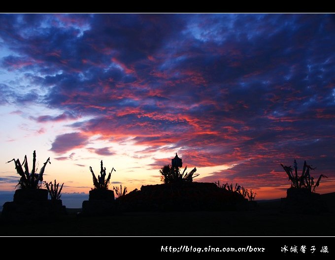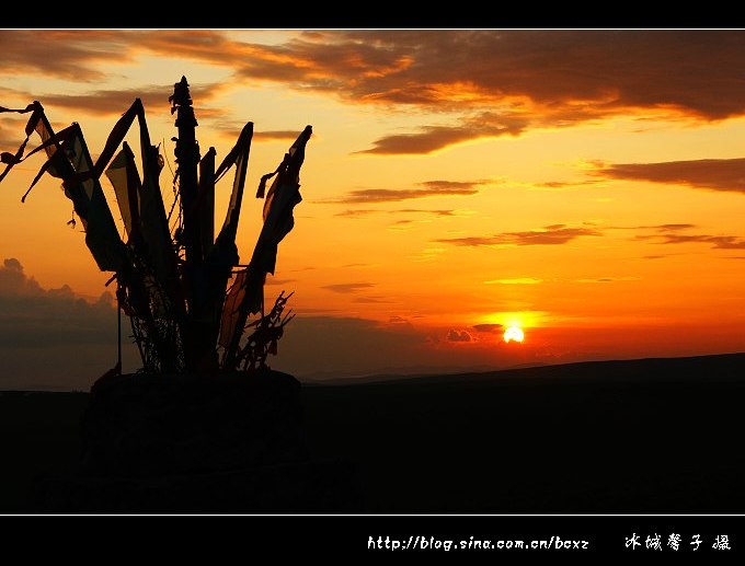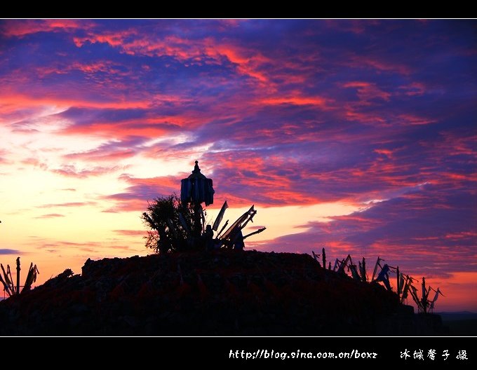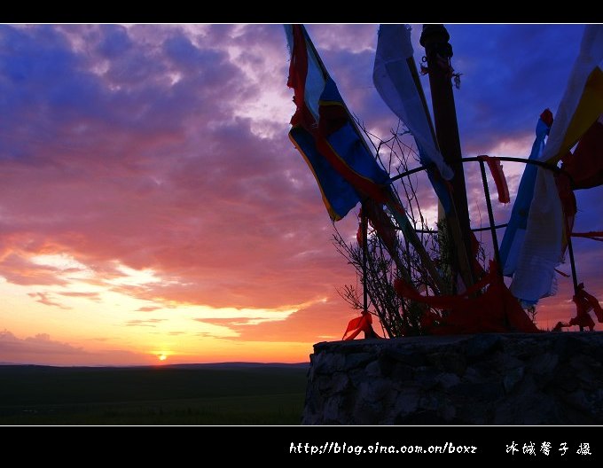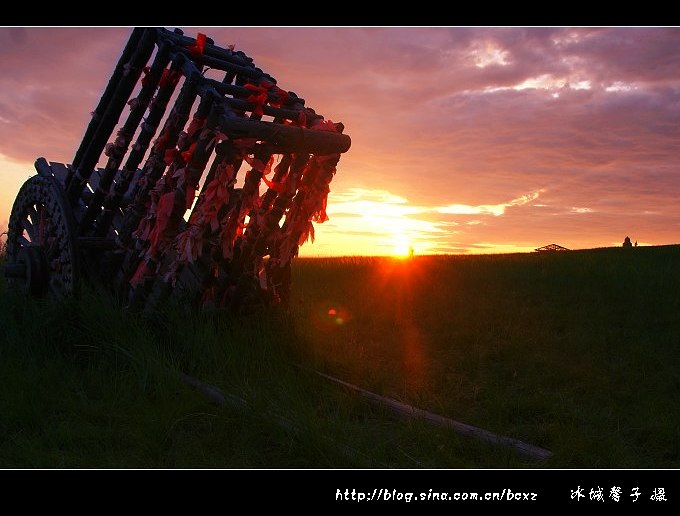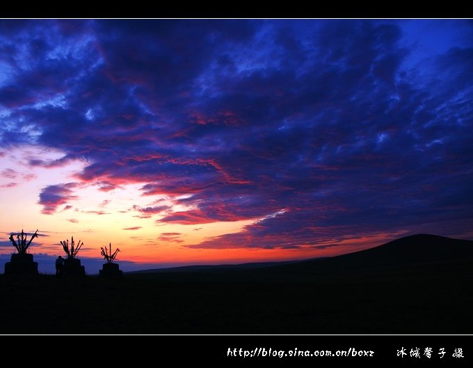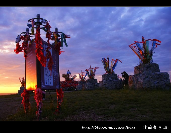 在草原上看日出,想想都很浪漫。可是,这样的浪漫并不是那么容易现实,因为呼伦贝尔草原夏季的日出非常早,七月份日出的时间基本在凌晨三点四十多分左右,所以要想要感受草原日出的浪漫与壮观,必须有点精神,有点毅力。呼伦贝尔“梦幻之旅”的第一站是著名的陈巴尔虎旗的金帐汗蒙古部落,当晚我们就住在了金帐汗的蒙古包里,我是个能贪黑但不能起早的懒人,但奇怪得很,每每出游我是绝不睡懒觉的,2011年7月18日凌晨三点半,随着高队的一声吆喝,我们便冲出蒙古包来到敖包山上,等待一场草原上的日出大戏的上演。