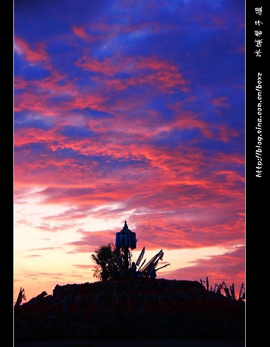 这个时候我喜欢各个角度转着,不同的视角都有着不同的构图的美感。惊喜的发现,太阳虽然还没露脸,但却将霞光折射在了头顶这片三角形的云彩上,泛出了道道金红色的云霞。敖包山是蒙古人祭祀的地方,这个时候把它做为前景,敖包堆以招展的身姿迎接了草原上的第一轮太阳,沉睡的蒙古包也禁不住诱惑,展开雄浑的腰身披上了草原上的第一道霞光。