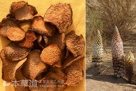 在茫茫无际的沙海中,有 一种灌木叫梭梭树,在这种灌木的根部寄生着沙漠之宝——肉苁蓉。肉苁蓉属多年生寄生草木,别名甜大芸、肉松蓉、苁蓉、地精。全株无叶绿素,黄褐色,叶小,鳞片状,其肉质肥大,含脂量高,因产在沙漠,所以属较名贵的特产。