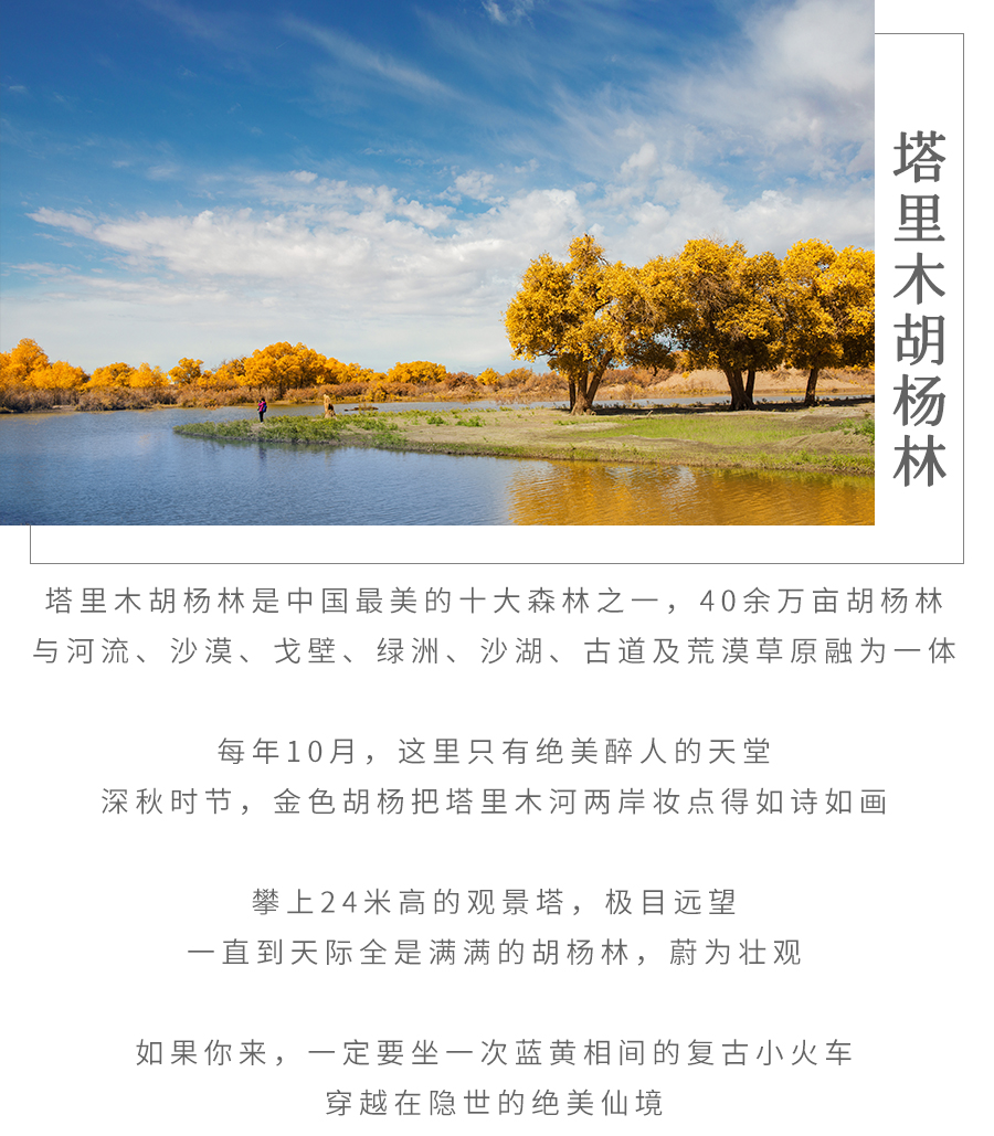 这些景点各具特色,展示了塔克拉玛干沙漠的荒凉与沧桑、塔里木河的狂野与浪漫以及胡杨林的绚烂与多情。
