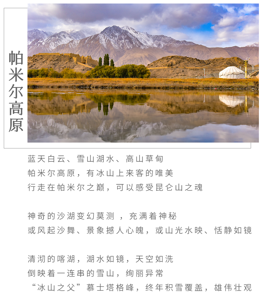 慕士塔格峰与公格尔峰及公格尔九别峰,三山耸立,如同擎天玉柱,成为帕米尔高原的标志和代表;