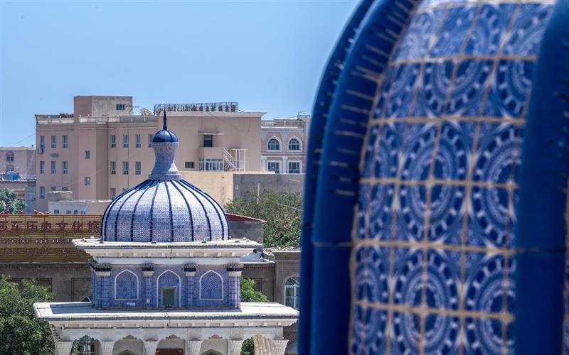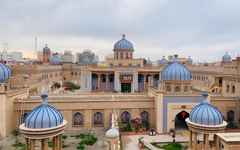 整体建筑风格融合了中亚与伊斯兰特色,以蓝、黄为主色调,装饰精美,