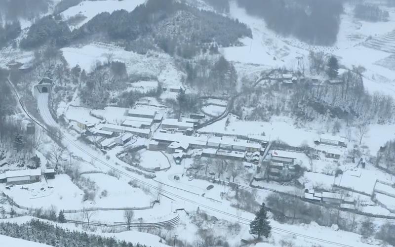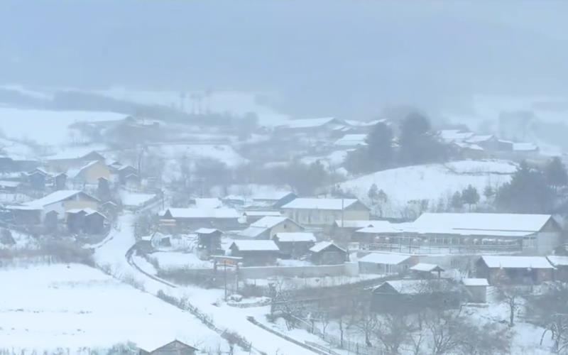 村落沿岭而建,黑瓦木墙覆上白雪,清晨炊烟袅袅,与雾凇、白桦林共同构成一幅水墨画卷。