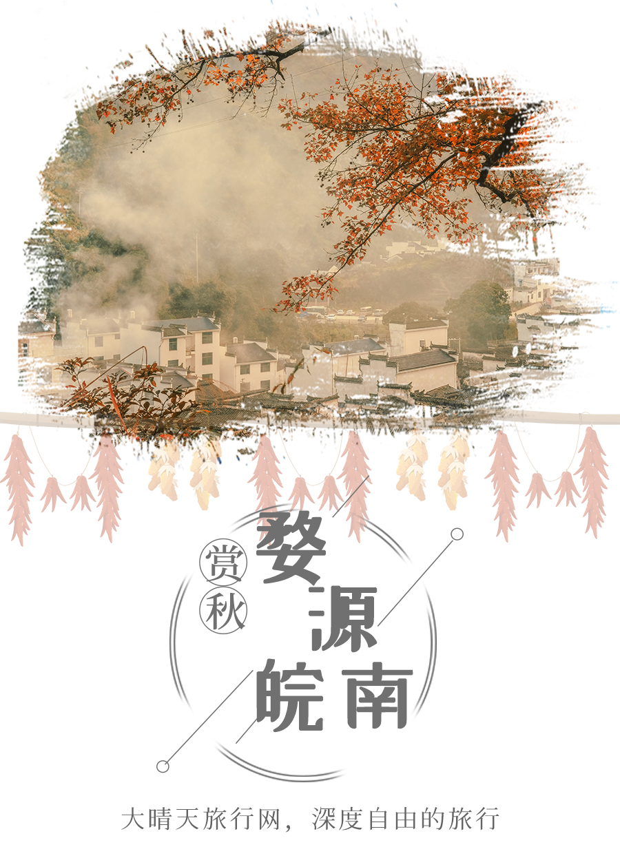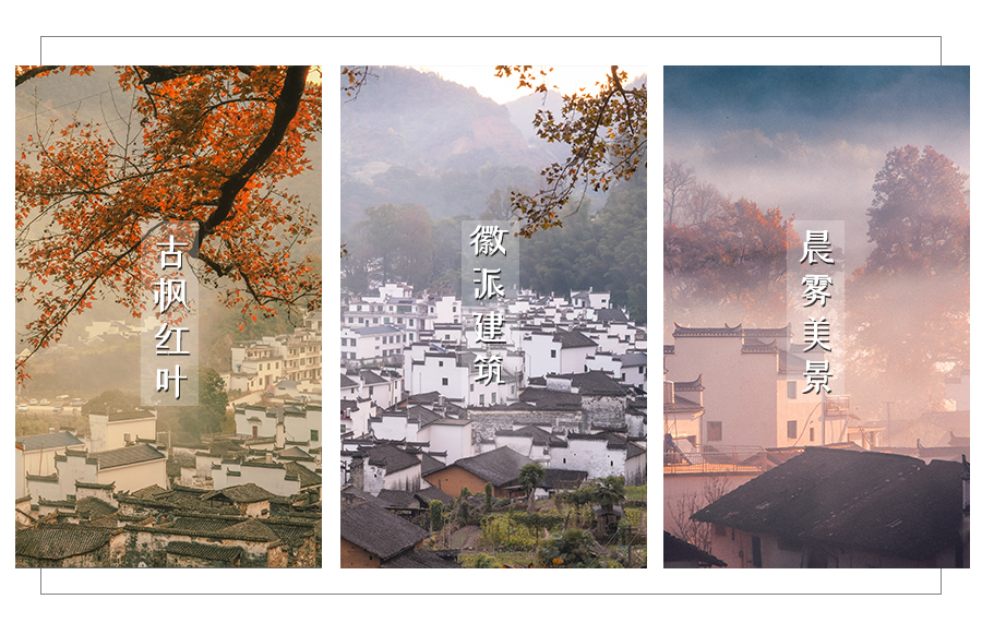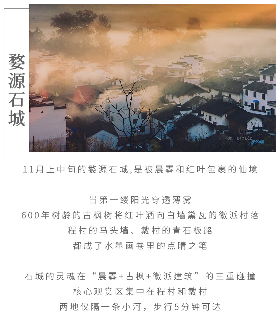 在日落和晨曦中,云雾与炊烟、古枫树林、徽派建筑村落相互辉映,美得仿若仙境,如梦如幻,是吴冠中大师画笔下的情景再现。