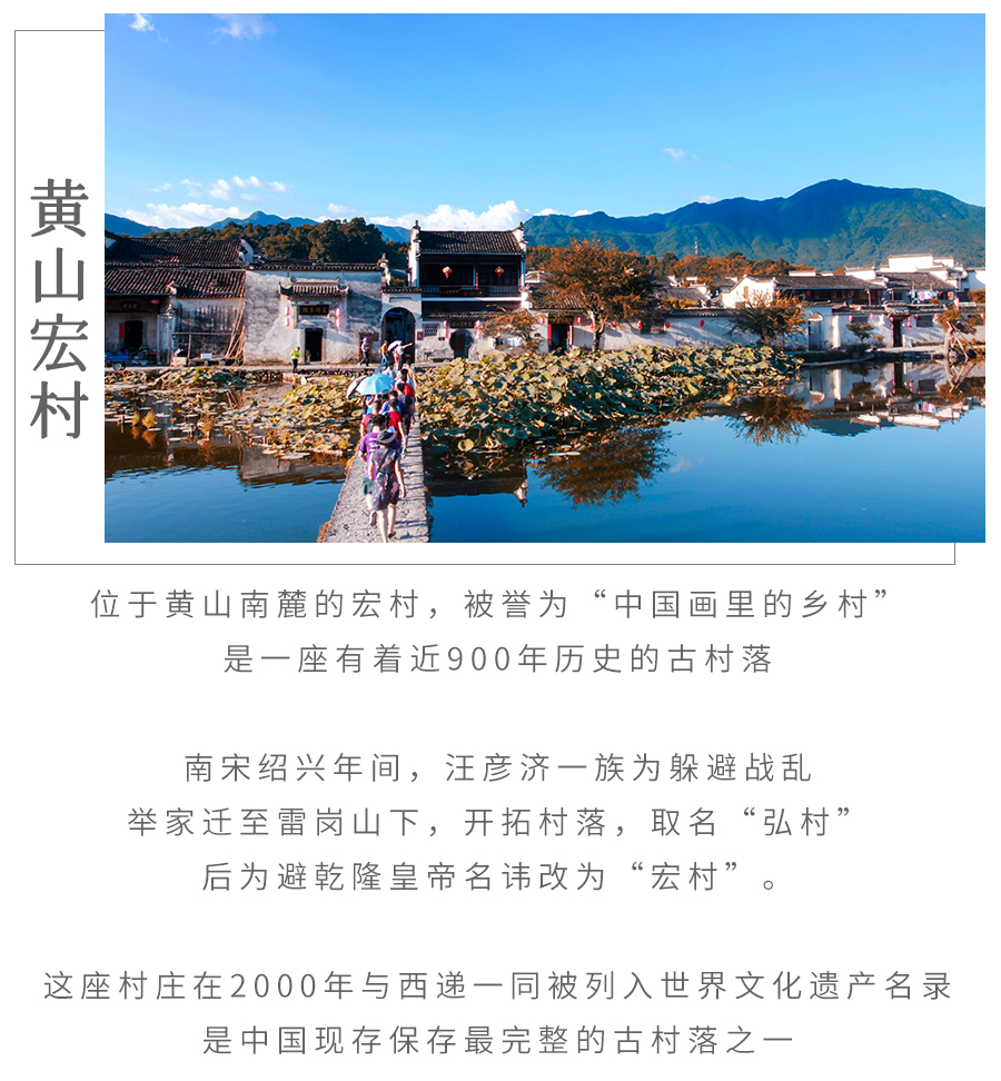 活动:宏村在皖南众多风格独特的徽派民居村落中,宏村是最具代表性的,全镇完好保存明清民居140余幢;