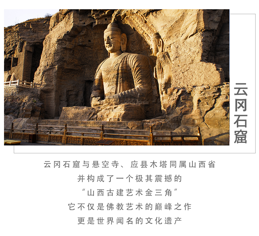 活动:云冈石窟石窟依山开凿,东西绵延约1公里,现存主要洞窟45个,大小窟龛252个,最大造像高达17米,最小仅几厘米。