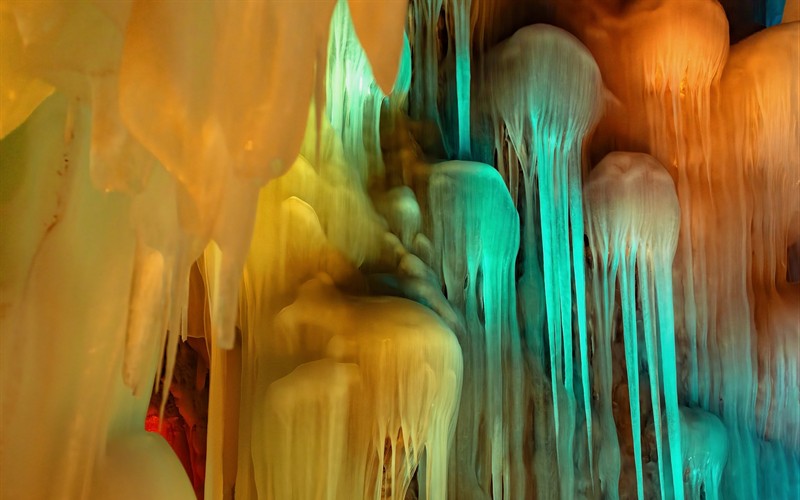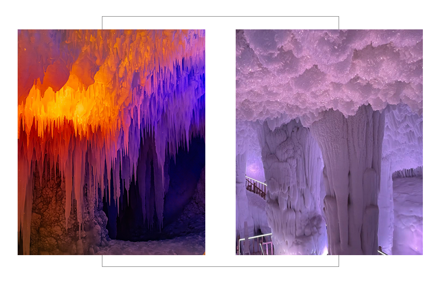 冰的形态多达10余种,如冰笋、冰柱、冰锥、冰葡萄等,晶莹剔透、美轮美奂。