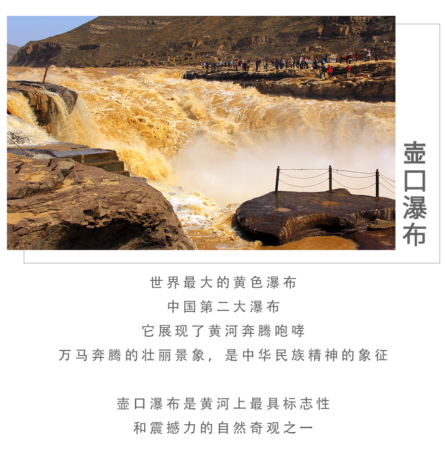 活动:壶口瀑布壶口瀑布位于山西省吉县和陕西省延安市宜川县的交界处,是中国第二大瀑布,也是世界上最大的黄色瀑布。