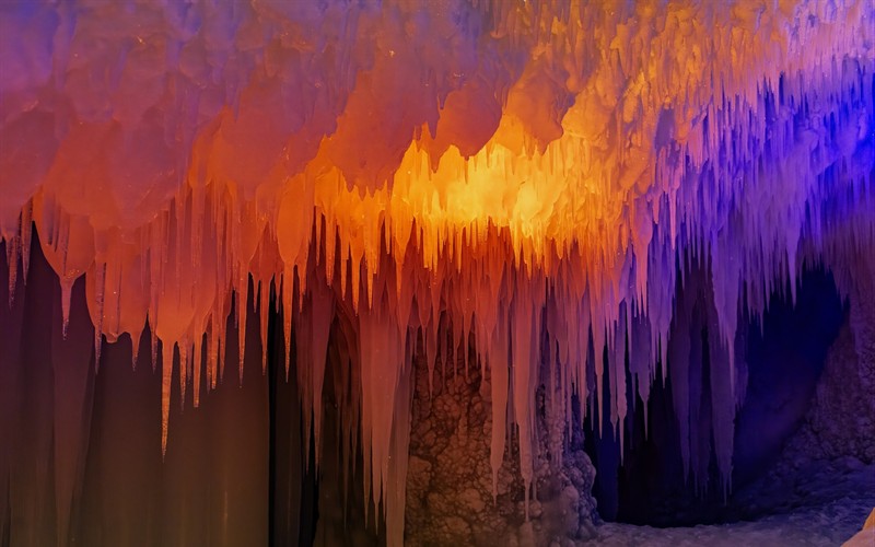 洞内四壁皆冰,冰柱、冰笋、冰钟乳、冰石花以及其它冰晶景观结构分布整个空间。