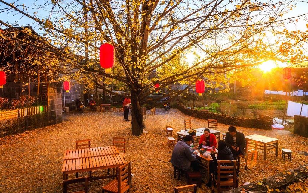 可以随意在村寨中穿梭,走进一片金黄的农家小院,惬意的喝着茶,悠闲的品尝当地特色美食,陶醉于银杏村的金色童话世界中,为那一树树灿若黄金的奇特景观叹服!