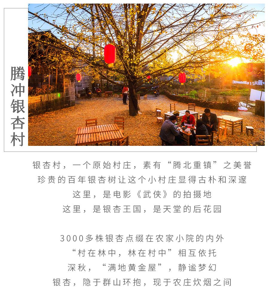 晨曦的银杏村,早晨的阳光透过树叶缝隙投下美丽的斑驳光影,整个村庄都掩映在一片金黄中,这又是另外一番景象,每家每户都种有银杏树,有些银杏树树龄上百年了,叶子掉得比较早,树下都是金黄色,通透明媚的阳光会将一棵棵银杏树照耀的无比醒目,在蓝天的映衬下更加耀眼,结束后送腾冲机场结束这难忘的四天旅程